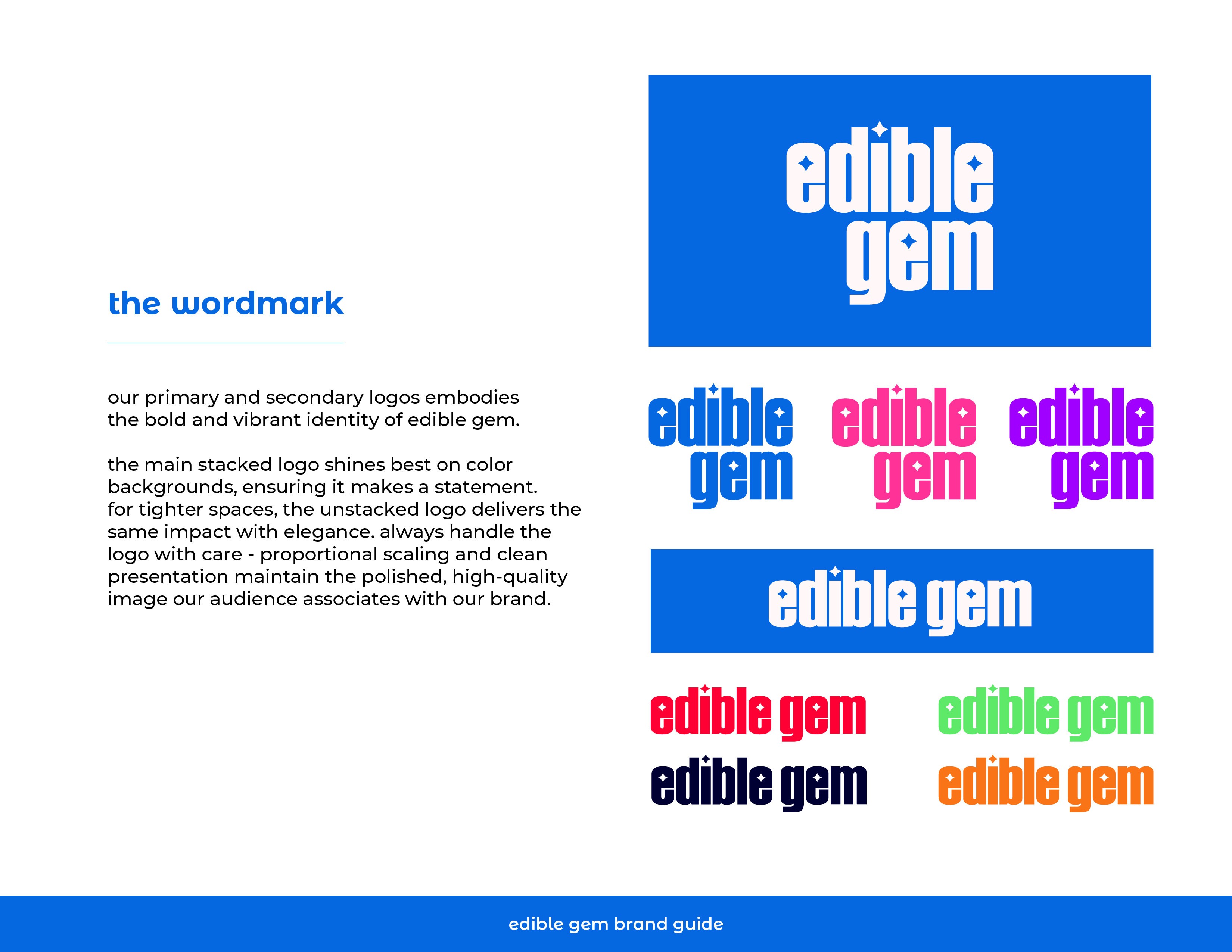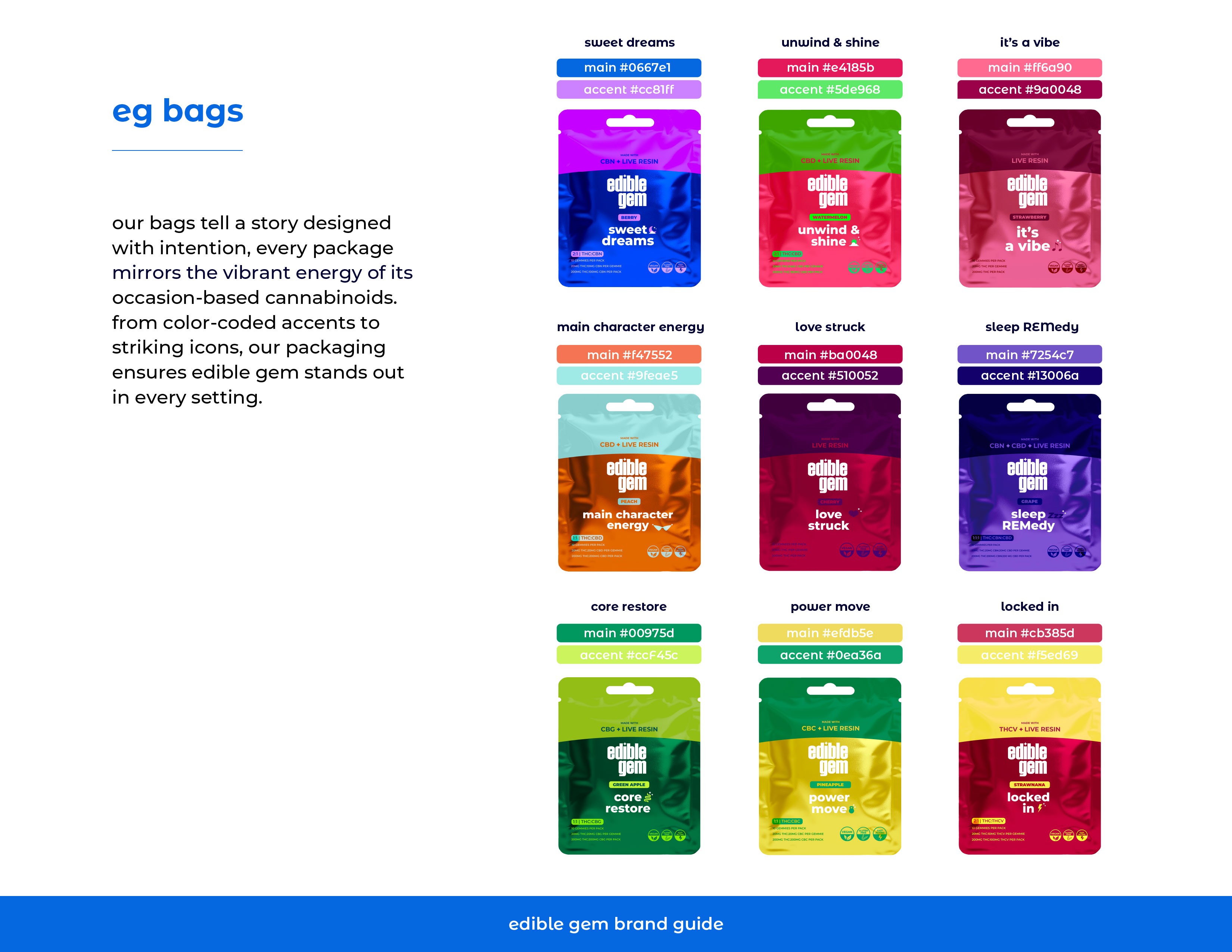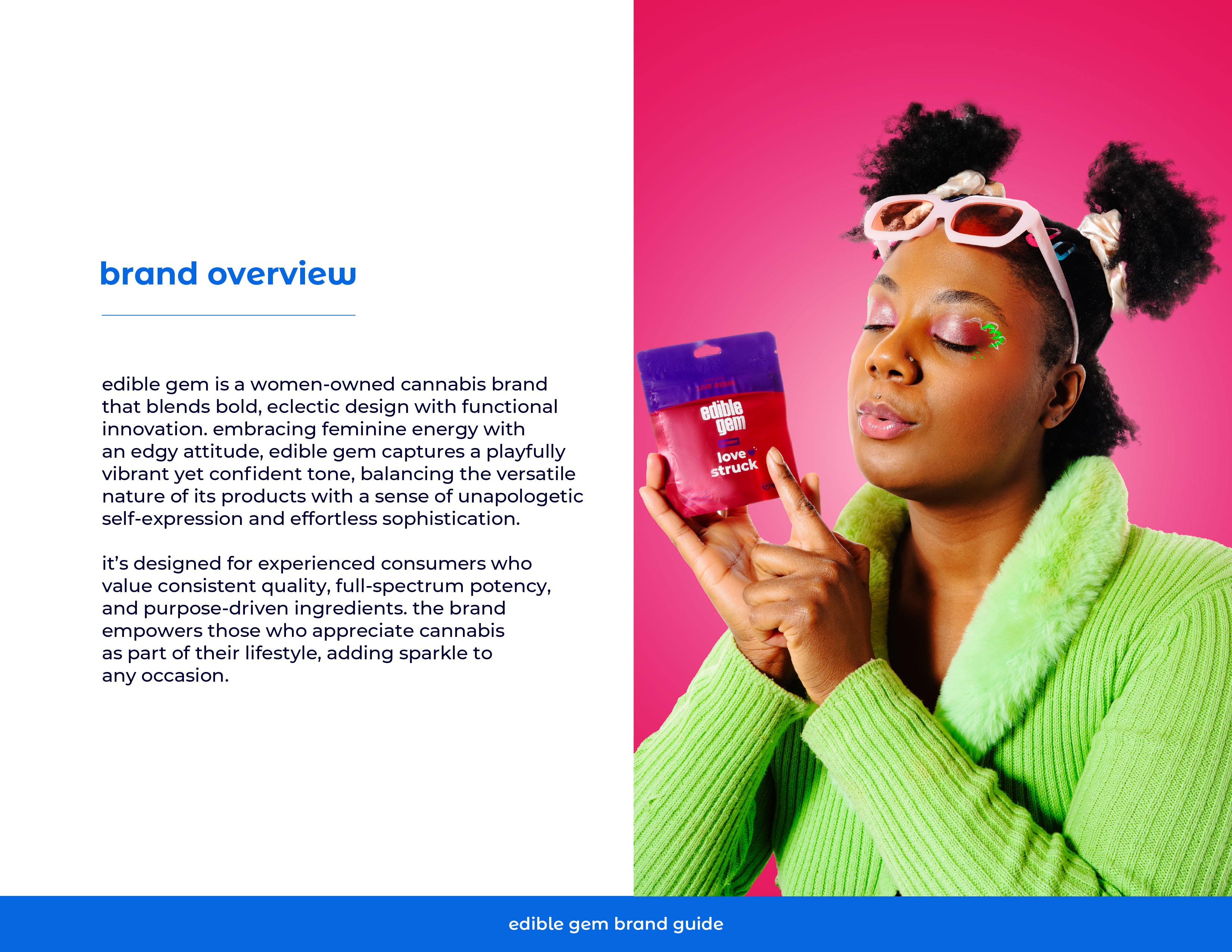 edible gem is a women-owned cannabis brand that blends bold, eclectic design with functional innovation. embracing feminine energy with an edgy attitude, edible gem captures a playfully vibrant yet confident tone, balancing the versatile nature of its products with a sense of unapologetic self-expression and effortless sophistication.