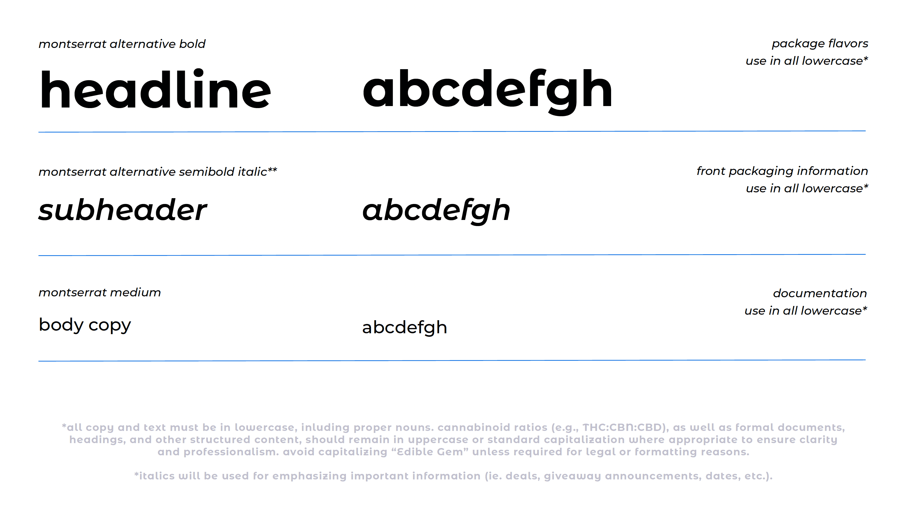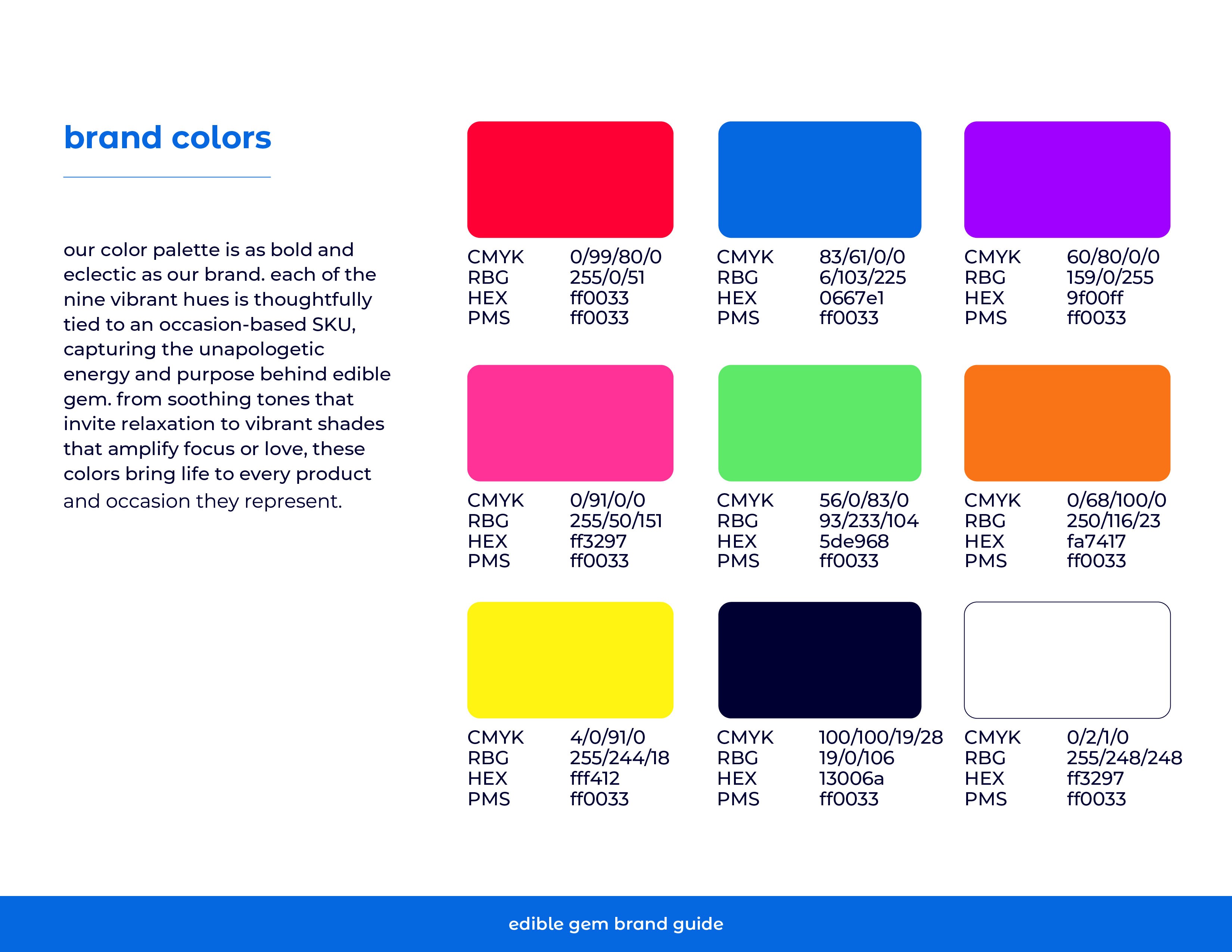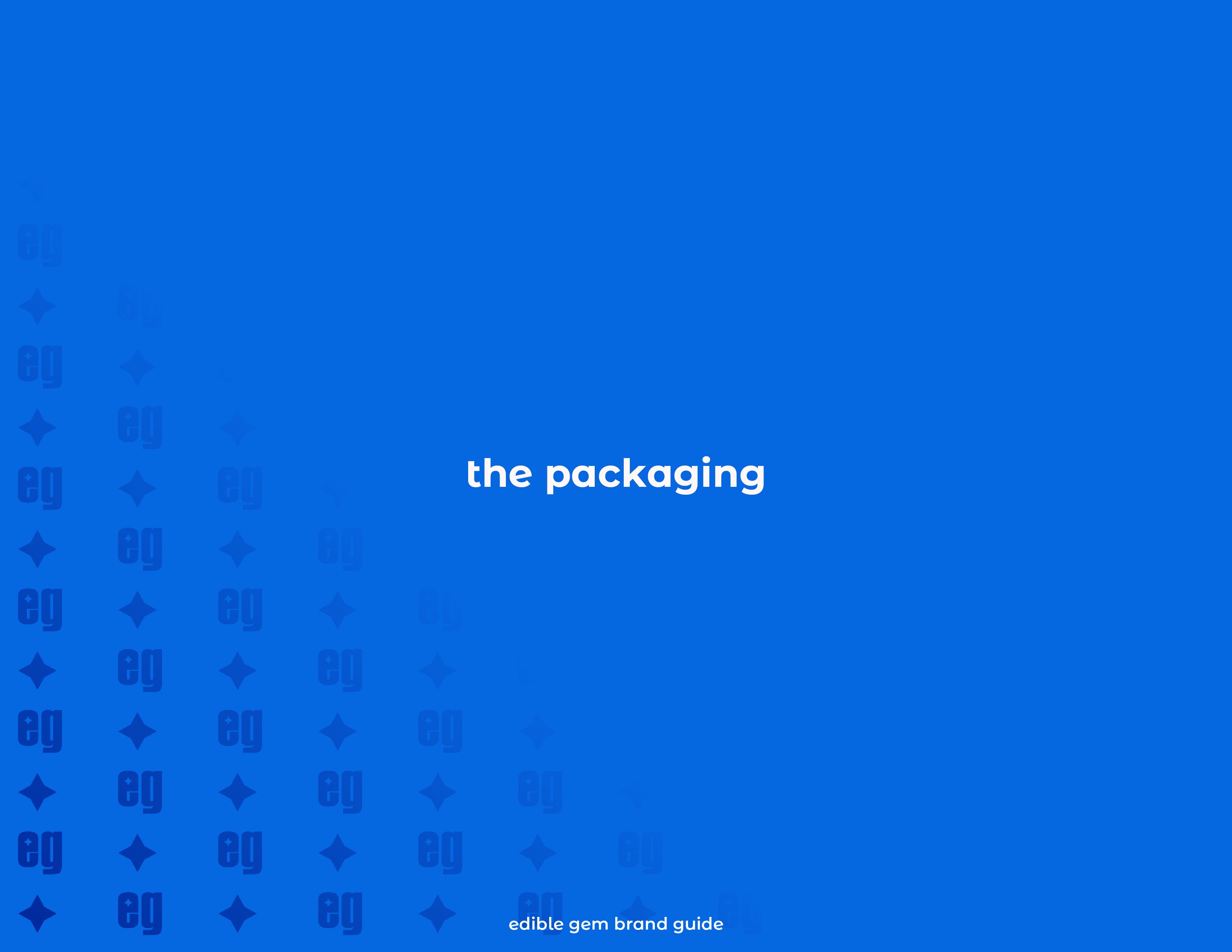 As a collaborative effort, our team landed on a simplistic yet colorful packaging to showcase the fun loving, bold branding of Edible Gem. Each SKU includes the respected flavor colors as well as a custom icon next to the flavor name.