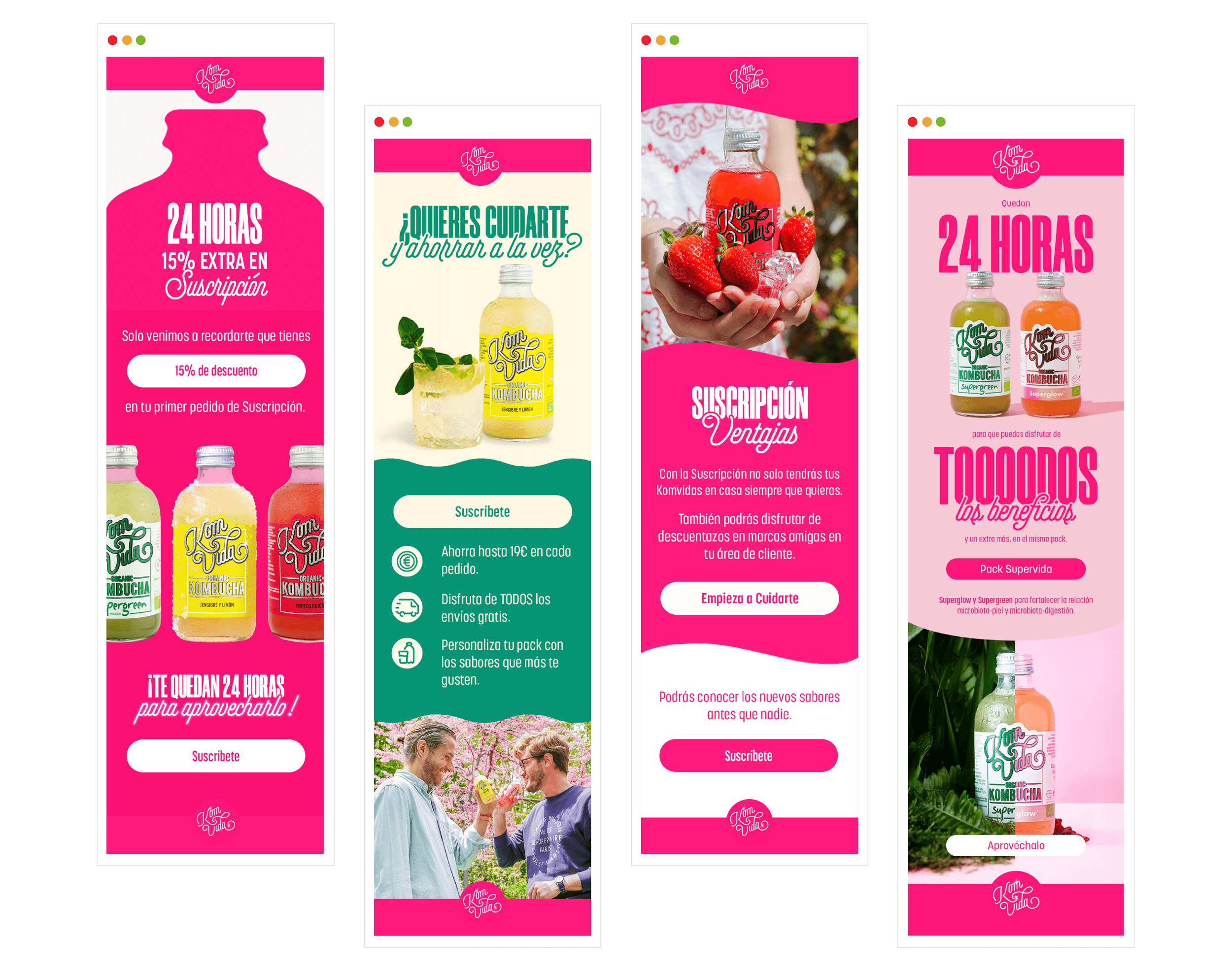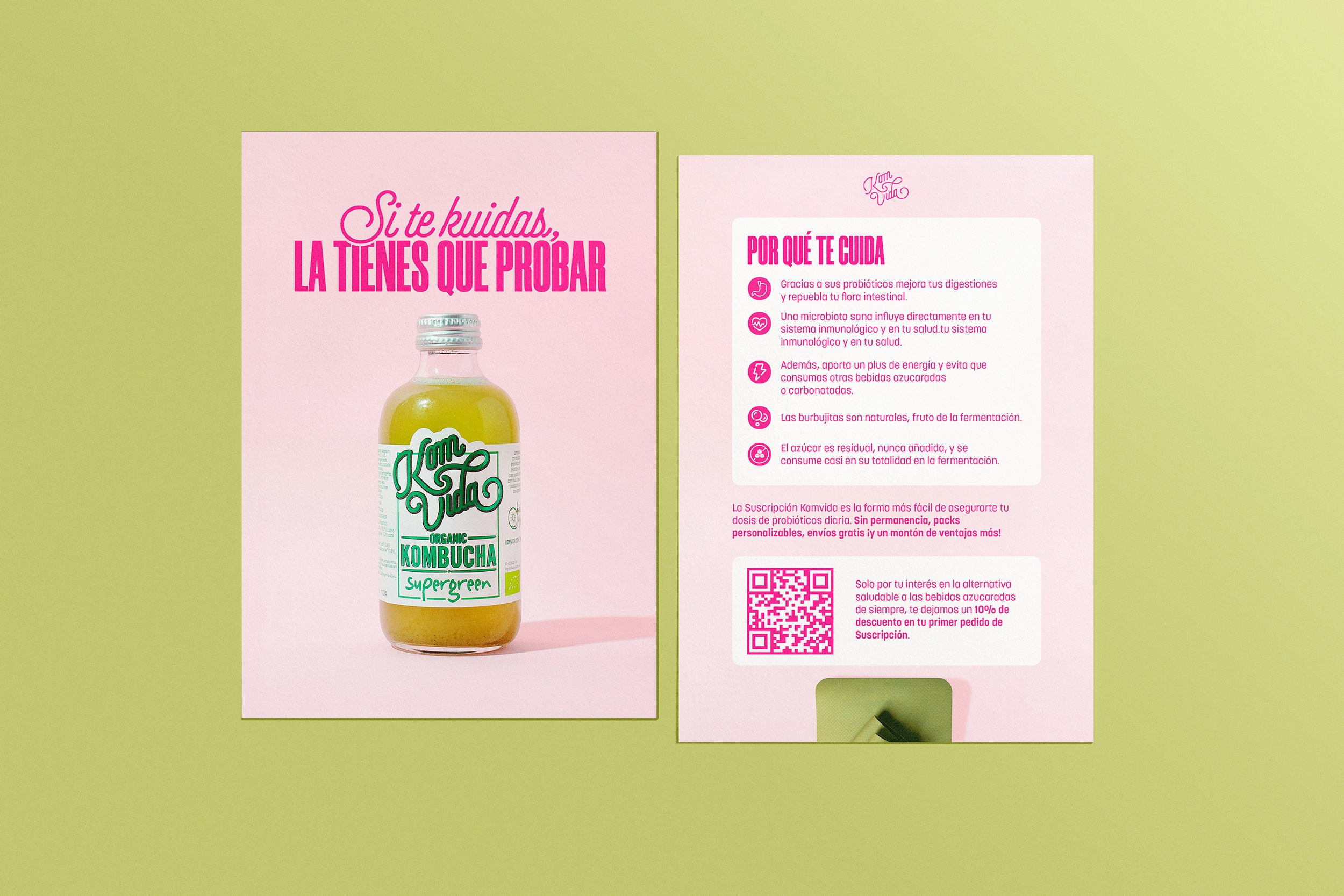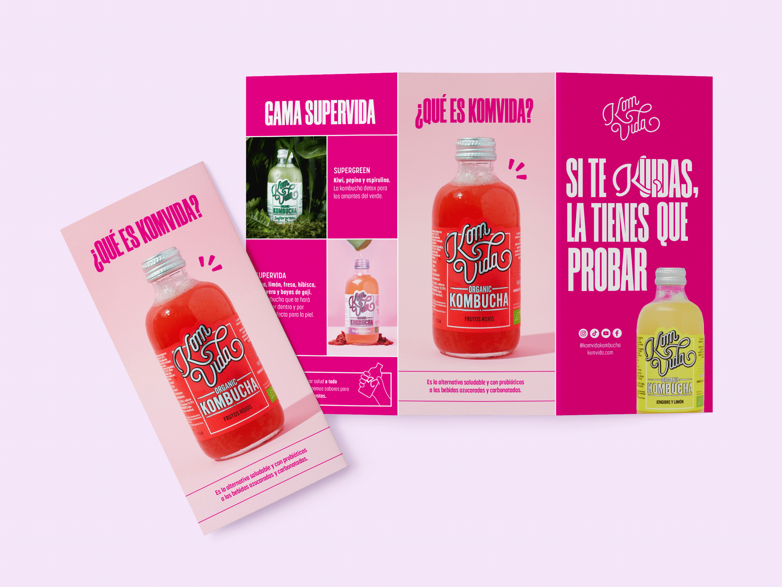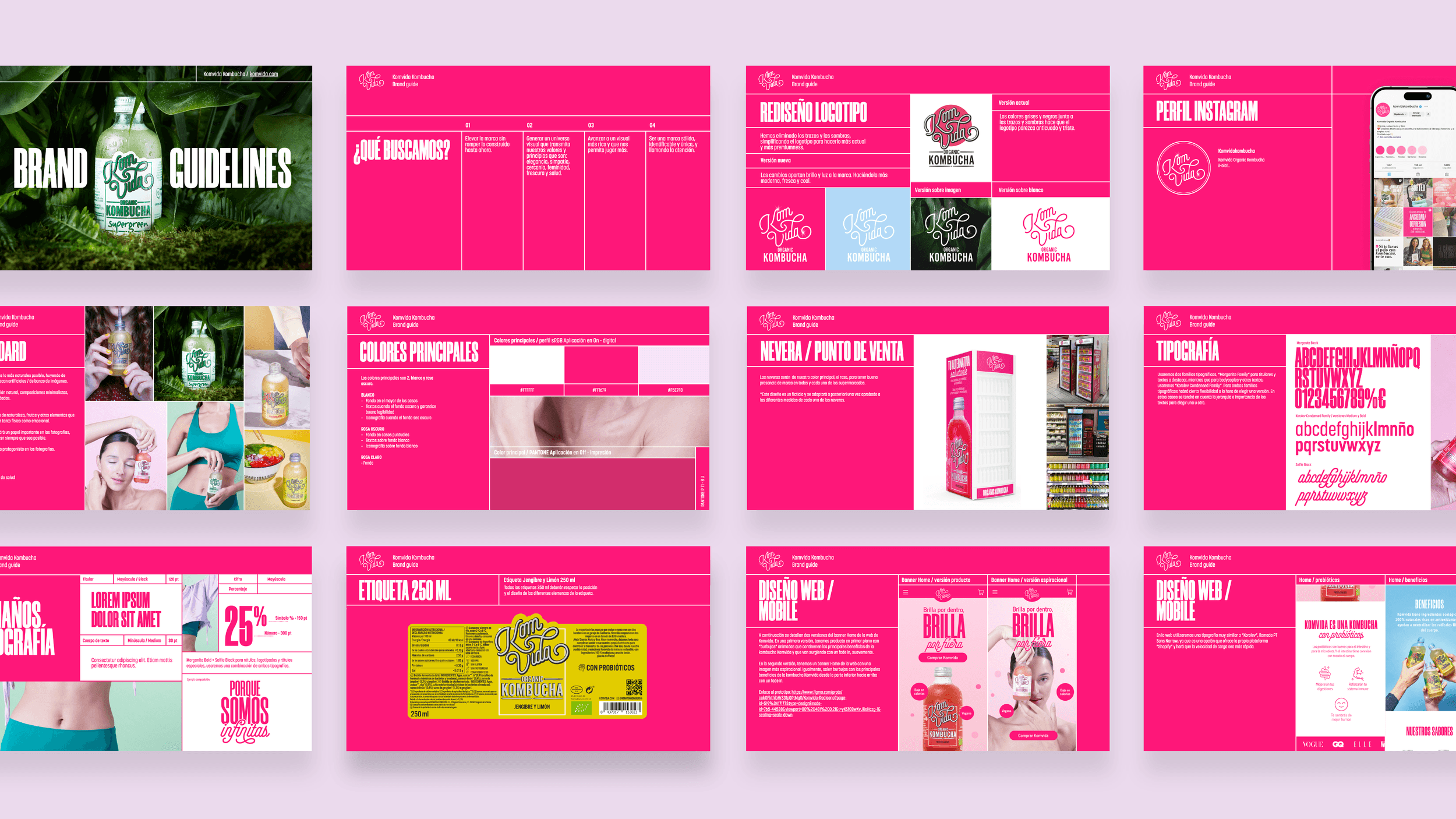 Created by Bea and Nuria, Komvida Kombucha is the healthy alternative to soft drinks ideal for any time of the day. With a fresh yet strong, fuchsia pink look, this brand is expanding their girl-empowering, entrepreneurial influence around Spain via their eye-candy graphics, inviting adverbs and interactive social media post.